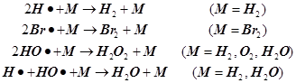 где R1, R2- обладающие свободной валентностью атомы или молекулярные свободные радикалы, а M - любая третья частица. С формально-кинетической точки зрения всякий такой процесс выглядит как процесс второго порядка, и третья частица не учитывается в материальном балансе и не определяет стехиометрию процесса.