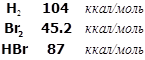 Энергии диссоциации участников реакции позволяют качественно оценить последовательность распада их молекул. Здесь «слабое звено» - молекула Br2 , сравнительно легко претерпевающая гомолиз. Эта ре акция была исследована при 200-300oC и оказалась состоящей из пяти элементарных стадий. Принцип Боденштейна приводит к превосходному описанию кинетики процесса. Кинетическое уравнение для целевого продукта выводится из кинетической схемы. Элементарные стадии представлены в таблице1: