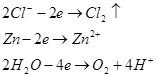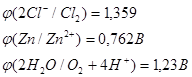 Перенапряжение выделения кислорода на цинковом электроде при плотности тока 1мА/см2 равно 1,75 В. Это значит, что кислород данной реакции выделятся не будет и на аноде возможны только две электрохимические реакции: