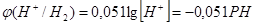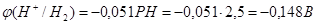 Рассмотрим электродные процессы на катоде. Материал катода – уголь или графит, катод инертен и не будет брать участия в электрохимических процессах. На катоде также возможны несколько реакций, рассмотрим их. РН среды равно 2,5. На графите при температуре 20ºС перенапряжение выделения водорода при плотности тока 1 А/см2 равно 1,2 В, а при плотности тока 1 мА/см2 всего лишь 0,6 В. За уравнением Нернста мы можем вычислить значение потенциала перенапряжения водорода при РН=2,5. потенциал водородного электрода находится в линейной зависимости от РН среды.