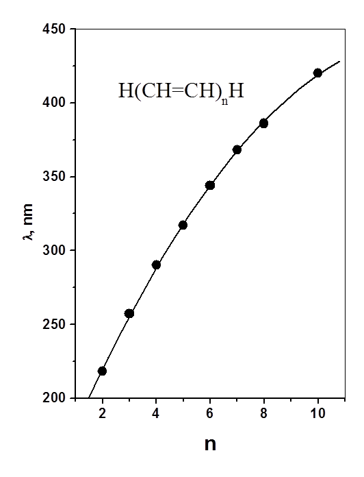 Зависимость положения максимума поглощения от числа двойных связей в молекуле замещенного полиена