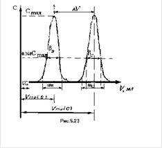Положение точки перегиба на фронтальной кривой необходимая, но еще недостаточная информация для выбора условий хроматографического концентрирования и разделения. Существенное значение имеет размытие зоны вещества в хроматографической колонке, определяемое кинетикой реакции межфазного перехода веществ, скоростью фильтрации раствора и геометрическими характеристиками сорбента. Не обсуждая вклад каждой из возможных составляющих в размытие зоны хроматографируемого вещества, его можно охарактеризовать интегральным параметром: b-шириной основания пика между точками пересечения касательных в точках перегиба концентрационной кривой и осью абсцисс (в элютивном варианте, см. рис.2) или между точкой пересечения касательной к точке перегиба и осью абсцисс и точкой, являющейся проекцией точки пересечения касательной с концентрационной кривой на ось абсцисс (во фронтальном варианте, см. рис.1).