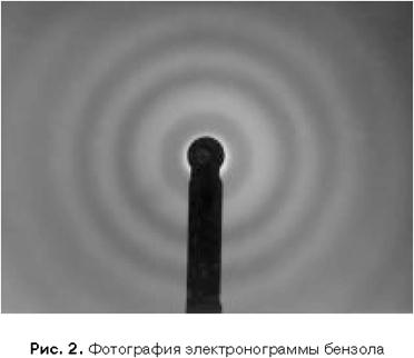 Резкое падение интенсивности рассеянных электронов с увеличением угла рассеяния компенсируется вращающимся перед фотопластинкой сектором – пластинкой из немагнитного материала, которая имеет такой вырез, что количество электронов, прошедших через эту щель, увеличивается с увеличением радиуса r дифракционной картины как r 3. Введение сектора компенсирует резкое падение интенсивности рассеяния электронов. Электронограммы, полученные с использованием сектора, можно микрофотометрировать, то есть проводить количественные определения почернений фотопластинки, пропорциональных интенсивности рассеянных электронов. Визуально на электронограмме видны концентрические диффузные кольца убывающей интенсивности с увеличением угла рассеяния (рис. 2). Конструкция сектора не позволяет получить дифракционную картину вблизи основного нерассеянного пучка электронов. Для того чтобы при данной геометрии дифракционной камеры измерить картину от минимальных углов рассеяния до максимальных, необходимо проводить съемки электронограмм по меньшей мере с двух расстояний: около 200 и 400 мм.