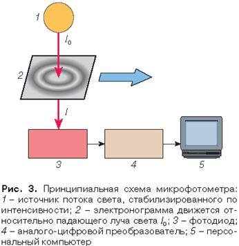 Неотъемлемой частью электронографического эксперимента является количественное измерение интенсивности рассеяния электронов. Оно осуществляется на специальном приборе, называемом микрофотометром или денситометром (рис. 3). Упрощенная схема микрофотометрирования состоит в установке фотопластинки под оптический луч, интенсивность которого стабилизирована в высокой степени. Столик с фотопластинкой совершает кача