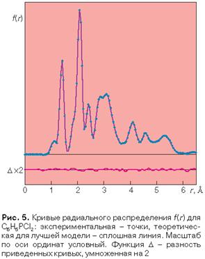 носится к связям углерод-углерод в бензольном кольце молекулы С6Н5РCl2 , а пик при 2,00 Б – к связям Р – Cl. К сожалению, не все пики хорошо разрешаются, особенно для сложных молекул. Это накладывает существенное ограничение на возможности определения геометрии молекул. Из рис. 5 видно, что пик при 1,10 Б для С – H – связей значительно меньше по высоте, чем пик для связей С – С и Р – Cl. Это значит, что длина связи С – Н определяется с меньшей точностью. В некоторых случаях метод газовой электронографии бессилен определить необходимые геометрические параметры. Тогда привлекают данные других методов или закономерности в геометрии сходных молекул. Подобного рода ограничения присущи также другим методам.
