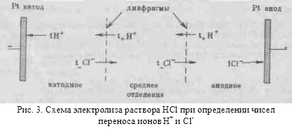 Различие в скоростях движения анионов и катионов приводит к тому, что они переносят разные количества электричества, но это не влечет за собой нарушения электронейтральности раствора, а лишь изменяет концентрацию электролита у катода и анода. Связь между числами переноса, подвижностями ионов и изменением содержания электролита в катодном и анодном отделениях можно установить, составив материальный баланс процесса электролиза. На рис.3 приведена схема электролиза соляной кислоты. Электродами служат пластинки из инертного металла (платины). Пространство между электродами разделено двумя пористыми диафрагмами на три отделения: