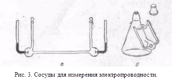 Поляризацию можно устранить платинированием платиновых электродов (т. е. покрытием их путем электролиза тонким слоем платиновой черни и, таким образом, увеличением поверхности электродов) и применением переменного тока с частотой 500—2000 гц для устранения концентрационной поляризации. Для измерения электропроводности используют сосуды самой различной формы. Сосуд снабжен двумя одинаковыми плоскими параллельными электродами, закрепленными так, чтобы расстояние между ними не изменялось. .На рис. 3 показаны формы сосудов, рекомендуемых для определения электропроводности при больших (рис. 3,а) и при малых (рис. 3,б) концентрациях.