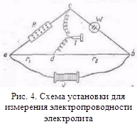 Сопротивление раствора определяется при таком положении контакта d, при котором в телефонной трубке не слышно никакого звука, и следовательно, ток в линии cd отсутствует. При этом положении контакта согласно закону Кирхгофа сопротивления R, W, r1, r2 связаны соотношением