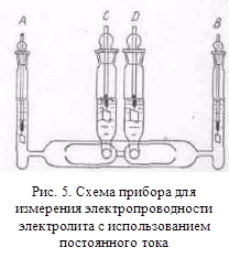 Использование переменного тока позволяет измерять электропроводность электролитов с высокой точностью, но при этом возникают затруднения, связанные с наличием электрической емкости и самоиндукции (особенно первой) в электрической схеме, тогда как необходимо измерять толькоомическое сопротивление. При использовании постоянного тока перечисленные затруднения отпадают, но возникает концентрационная поляризация. Чтобы избежать появления концентрационной поляризации, измеряют разность потенциалов между специальными, строго обратимыми электродами, расположенными на значительном расстоянии от питающих электродов. Современная потенциометрия позволяет измерять Е с точностью до 0,0001%. На рис. 5 изображен один из сосудов, где С и D— электроды для измерения разности потенциалов, а А и B - питающие электроды. Измеряется разность потенциалов Е, при токе постоянной силы между электродами А и B и разность потенциалов Ео на концах точно известного сопротивления Wo, включенного последовательно с сосудом; очевидно, искомое сопротивление W1 определяется из соотношения