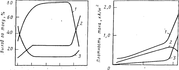 Рис. 3. Зависимость плотности тока, расходуемой на образование СLO4 и СL2, а также общей плотности тока от концентрации НСL в электролите (4 н. раствор НСLO4) при температуре —20°С: 1 —общий ток; 2—ток на образование СLO4-; 3—ток на выделение СL2 |