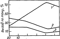 Рис.2. Зависимость выхода по току различных продуктов электролиза от концентрации хлороводородной кислоты в 4 н. растворе хлорной кислоты при температуре —20 °С: 1 — НСLO4; 2 — С12; 3 —О2 |