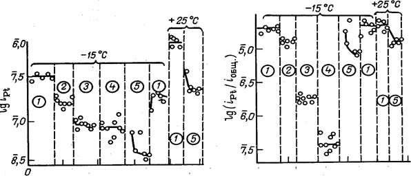 Насыщение электролита элементарным хлором снижает плотность тока растворения платины, но мало влияет на долю тока, расходуемого на растворение, так как практически в равной мере снижаются скорости основных анодных процессов и общая плотность поляризующего тока .