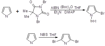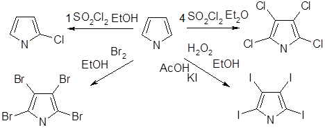 2-Бром - и 2-хлорпирролы — нестабильные соединения, которые можно получить прямым галогенированием пиррола. Использование 1,3-дибром-5,5-диметилгидантоина в качестве бромирующего агента приводит к образованию 2-бром - и 2,5-дибромпирролов; продукты бромирования стабилизируют немедленным превращением в N-трет-бутилоксикарбонильные производные. Бромирование N-трет-бутилоксикарбонилпиррола с использованием N-бромсукцинимида приводит к 2,5-дибромпроизводному