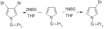 При монобромировании и моноиодировании N-триизопропилсилилпиррола образуются практически исключительно 3-галогенозамещенные пирролы, а использование двух эквивалентов N-бромсукцинимида позволяет получить 3,4-дибромпроизводное