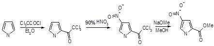 Алкильные заместители облегчают процесс ацилирования по атому углерода: так, 2,3,4-триметилпиррол превращается в 5-ацетилпроизводное даже при кипячении в уксусной кислоте. Более реакционноспособные трифторуксусный ангидрид и трихлорацетилхлорид реагируют с пирролом даже при комнатной температуре с образованием продуктов 2-ацилирования, которые в результате гидролиза или алкоголиза обеспечивают удобный синтетический подход к пиррол-2-карбоновым кислотам или их эфирам.