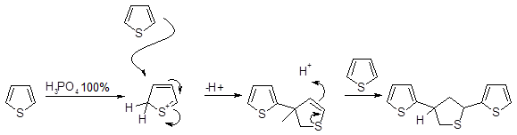 Вследствие высокой стабильности тиофенов в их реакциях электрофильного замещения могут быть успешно использованы комбинации ряда реагентов с сильными кислотами, обычно приводящие к кислотно-катализируемому разложению и полимеризации фуранов и пирролов. Изучение катализируемого кислотами обмена на атом водорода других групп, например кремния или ртути , показало, что скорость атаки по положению 2 примерно в 1000 раз выше, чем по положению 3. Так, для 2,5-ди-трет-бутилтиофена рКа при образовании соли за счет протонирования по положению 2 составляет —10,2.При обработке тиофена горячей фосфорной кислотой получается тример, строение которого предполагает, что на первой стадии образование связи С—С вдет через α-протонированный катион.