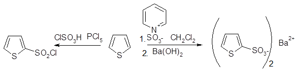 Получение тиофен-2-сульфокислоты при сульфировании серной кислотой уже давно известно, однако использование комплекса пиридинсульфотриоксид, возможно, более удобный метод. 2-Хлорсульфонилирование и 2- тиоцианирование также достаточно эффективны.