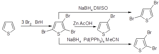 Трибромирование тиофена гладко протекает в 48%-ном растворе НВг. Давно известно, что при обработке полигалогенотиофенов цинком и кислотой удается селективно удалять α-галоген, что делает доступным получение 3-бромтиофена, а 3,4-дибромтиофен аналогично образуется при восстановлении тетрабромида. При использовании боргидрида натрия из 2,3,5-трибромтиофена получают 2,3-дибромтиофен (в присутствии катализатора Pd(0))или 2,4-дибромтиофен (без катализатора).