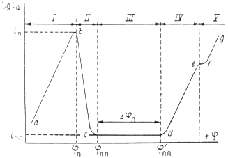 На рис.5 приведена анодная кривая, которую мы подробно рассмотрим. Активное растворение продолжается до потенциала, отвечающего точке b. При этом ток равен критическому току пассивации