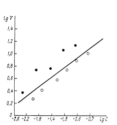 Рис. 9. Сопоставление опытных (-l- и -¡- - данные двух авторов) и расчётных (прямая линия) коэффициентов торможения кислотной коррозии железа при введении разных количеств диэтиланилина.