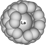 Молекулы фуллеренов, в клетку которых заключены один или несколько атомных частиц (атомов или молекул), получили название эндоэдральных соединений (или эндоэдралов). Для обозначения таких молекул используется формула Мm@Сn где М — инкапсулированный атом или молекула, а нижние индексы m и n указывают на число таких атомов и атомов углерода в молекуле фуллерена соответственно [12]. Рекомендуемое IUPAC название для La@C82 звучит следующим образом “[82] fullerene-incar-lanthanum” и записывается в виде iLaC82 [13].