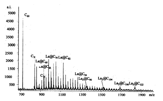 Синтез эндоэдральных фуллеренов в микроколичествах был впервые осуществлен в работе [14], существенной особенностью, которой было использование в качестве лазерной мишени композитного материала, полученного прессованием La2O3, графитового порошка и смолы. Мишень помещалась в цилиндрическую, заполненную гелием, подогреваемую камеру. Как показали результаты масс-спектрометрического анализа, при лазерном облучении металлографитового материала в атмосфере гелия наряду с полыми фуллеренами образуются также эндоэдральные соединения типа La@C2n, где n³30.