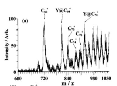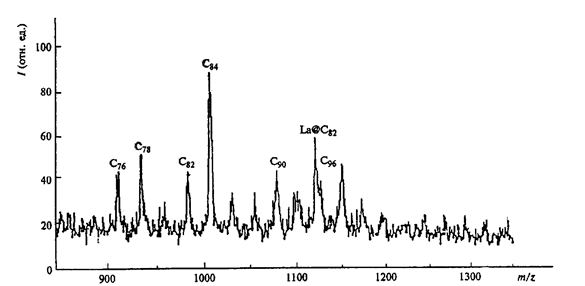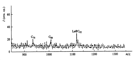 Расширение круга растворителей, используемых для экстракции эндоэдральных соединений из фуллеренсодержащей сажи, приводит к увеличению списка синтезируемых соединений. Так, применение для этой цели анилина [26] позволило выделить целую группу эндоэдральных соединений, куда вошли Y@C60, Ba@C60, La@C60, Ce@C60, Pr@C60, Nd@C60 и Gd@C60 при относительно низких температурах. При этом даже не понадобилось обеспечение анаэробных условий. Растворитель (анилин) прокачивался через сажу в течение 3 - 5 часов при температуре 273-278 К. Полученный экстракт исследовался в масс-спектрометре с лазерной десорбцией. Масс-спектр экстракта, полученного из сажи с помощью анилина, содержал пики указанных выше эндоэдральных соединений (рис. 8), причем интенсивность пиков, как правило, была соизмерима с интенсивностью пиков полых фуллеренов С60 и С70.
