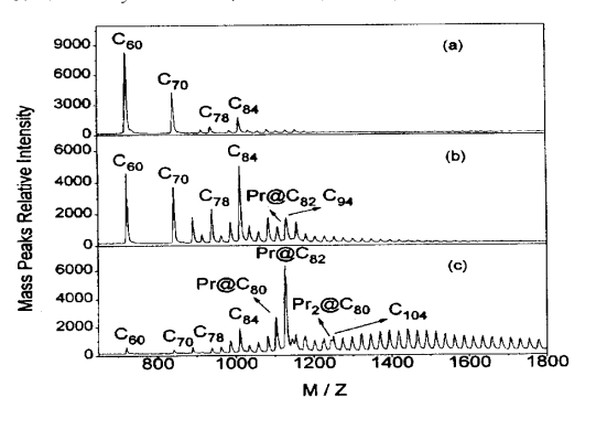 В работе [19] было предложено для увеличения выхода эндометаллофуллеренов проводить экстракцию под давлением и при высокой температуре, используя в качестве растворителей: толуол или пиридин. Масс-спектрометрический анализ толуольного экстракта (рис. 6a) полученного с использованием аппарата Сокслета показал, что экстракт содержит в основном полые фуллерены, в то время как эндофуллерены присутствуют на уровне фона. Проводя экстракцию толуолом под высоким давлением и при температуре 200 0С, эффективность экстракции возрастает, но содержание эндофуллеренов в экстракте по данным масс-спектрометрии меньше, чем фуллеренов (рис. 6в). Заменив толуол (дипольный момент которого равен 0,36 D) на пиридином (с дипольным моментом 2,19 D) удалось получить экстракт с выходом 0,6 % от веса сажи. Экстракция проводилась под давлением и при температуре 200 0С. В масс-спектре пиридинового экстракта основным молекулярным ионом является Pr@C82 (рис. 6с).