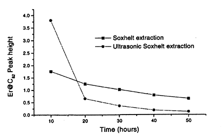 Количество Er@C82 выделяемого за 10 часов в УЗСЭ много больше чем в СЭ. За 30 часов экстракции в УЗСЭ выделяется до 90 % металлофуллеренов, а в СЭ только 50 %. Схематически процесс экстракции с применением ультразвука можно представить, как разрушение сажевых агрегатов и сольватация ДМФА фуллеренов и эндофуллеренов. Результатом применения ультразвука является ускорение процесса экстракции, но получаемые экстракты по данным ВЭЖХ остаются низко обогащенными Er@C82.
