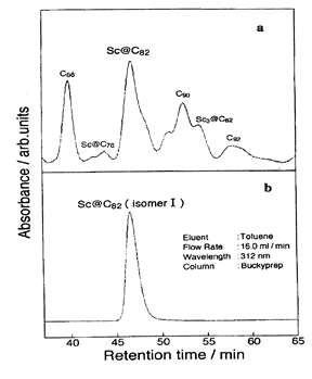 На рисунке 9 показаны типичные хроматограммы, которые наблюдаются при последовательном выделении эндоэдрального соединения Sc@С82(I) [32]. На первой стадии ВЭЖХ раствор экстракта эндометаллофуллеренов в толуоле разделяют, используя колонку Trident-Tri-DNP (Buckyclutcher I, 21 mm ´ 500 mm: Regis Chemical) или колонку 5-PBB(pentabromobenzyl) (20 mm ´ 250 mm, Nacalai Tesque) в качестве элюента используется CS2. На этой стадии отделяют фракцию, содержащую Sc@C2n от фракции С60, С70 и высших фуллеренов (С76-С110). Разделение и очистка скандий содержащих эндофуллеренов осуществляется на второй стадии ВЭЖХ с использованием колонки Cosmosil Buckyprep (20 mm ´ 250 mm, Nacalai Tesque), элюент толуол. Как видно, последовательное использование на различных стадиях очистки колонок, отличающихся сортом сорбента, позволяет освободить раствор от фракций, для которых время задержки близко к соответствующему значению для целевого продукта. В таблице 1 приведены эндометаллофуллерены выделенные методом ВЭЖХ [33].