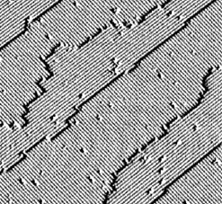 Из-за взаимодействия оборванных связей, атомы в приповерхностной области стремятся перестроиться в более энергетически выгодные положения, образуя на поверхности двумерную периодическую структуру. С помощью метода ДМЭ Шлиер и Фарнсворт [] впервые наблюдали реконструированную поверхность Si(100), имеющую элементарную ячейку 2x1 и домены двух типов, ориентированные вдоль направлений [011] и [0-11]. Атомы идеальной поверхности (100) имеют две ненасыщенные связи, одна из двух оборванных связей поверхностного атома вместе с соответствующей связью соседнего атома образует новую димерную связь. Соседние атомы притягиваются друг к другу образуя пары, что ведет к удвоению элементарной ячейки в направлении перпендикулярном рядам димеров. СТМ изображение чистой поверхности представлено на рисунке 2.