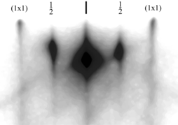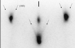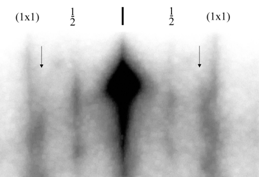 Центральное пятно – рефлекс зеркально отраженного пучка электронов. Три темные полосы, крайние боковые и центральная – тяжи, полученные пересечением обратной двумерной решетки со сферой Эвальда. Между ними находятся сверхструктурные тяжи, возникающие из-за присутствия на поверхности дополнительной периодичности (2x1).