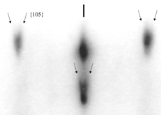 Рисунок 9.Дифракционная картина поверхности Si(100) с Ge "hut" кластерами (толщина пленки - 6 монослев). Стрелками показаны линии от рассеяния на гранях островков.
