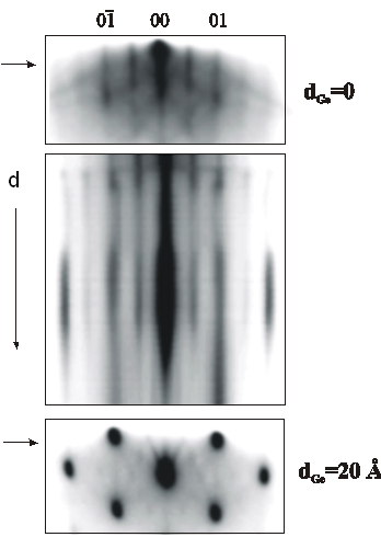 При толщине пленки около 1 монослоя (МС) на дифракционной картине формируется сверхструктура (2xN) где N=8-12. Эта структурная перестройка заключается в удалении рядов димеров с поверхности плёнки, что приводит к частичной упругой релаксации напряженного гладкого германиевого слоя, в результате на дифракционной картине появляются дополнительные сверхструктурные тяжи.