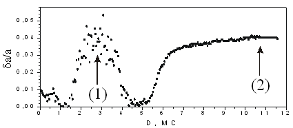 Рисунок 12. Изменение "параметра решетки" в процессе осаждения. (1) – Переход 2D-3D. (2) – Полная релаксация "dome" островков.