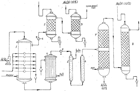 На ход реакции большое влияние оказывает концентрация этилена в исходном газе. При уменьшении концентрации соляной кислоты, t° реакции, парционального давления этилена и интенсивности перемешивания реагирующих веществ. С повышением концентрации кислоты скорость поглощения этилена увеличивается (93%-ная кислота поглощает в 10раз медленнее, чем 97,5%-ная), так как увеличивается скорость образования диэтилсульфата. В таком же направлении действует и повышение температуры до определённого предела. На рисунке 2 изображена схема производства спирта непрерывным способом.