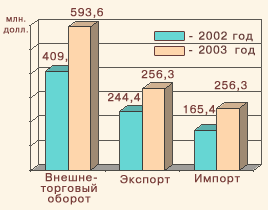 По итогам 2003 года внешнеторговый оборот Ставропольского края впервые за последние 6 лет превысил значение полмиллиарда долларов и составил 593,6 млн. долл., в том числе экспорт – 337,3 млн. долларов, импорт – 256,3 млн. долларов. По сравнению с 2002 годом внешнеторговый оборот вырос на 44,9%, в том числе экспорт – на 6%, импорт – в 1,5 раза (см. рис. 3.3.).[95]