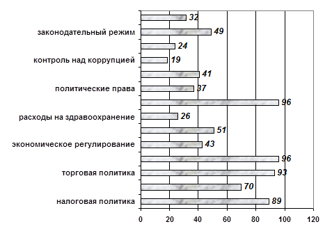 По оценкам 2004 года, Азербайджан имеет хороший уровень по степени экономической свободы: налоговая политика (89%), инфляция (70%), торговая политика (93%), кредитный рейтинг (96%), экономическое регулирование (43%). По социальным расходам ситуация ниже: расходы на образование (51%), расходы на здравоохранение (26%), иммунизация (96%). Блок правового регулирования имеет наименьшие оценки: политические права (37%), гражданские свободы (41%), контроль над коррупцией (19%), эффективность правительства (24%), законодательный режим (49%), избирательные права (32%) (рис.1.)[5].