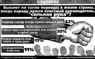 А история имеет свойство повторяться, и, как и раньше, к установлению новых тоталитарных, или авторитарных режимов, будут использованы все те же предлоги – необходимость наведения порядка. И это будет понятно, когда степень хаоса достигнет известных пределов. И так, по кругу, как говорил еще Платон, мы рискуем вновь вернутся к той же точке. Вот данные соцопроса в России 2001 г. :