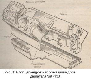 На головке цилиндров закреплены детали газораспределительного механизма. В головке цилиндров выполнены впускные и выпускные каналы и установлены вставные седла и направляющие втулки клапанов. Для создания герметичности между блоком и головкой цилиндров установлена прокладка, а крепление головки к блоку цилиндров осуществлено шпильками с гайками. Прокладка должна быть прочной, жаростойкой и эластичной. В двигателе ЗИЛ-130 она сталеасбестовая, . Для уплотнения стальной прокладки в расточку на нижней плоскости головки цилиндра запрессовано стальное кольцо с острым выступом.