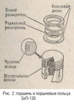 При установке поршня в цилиндр поршневое кольцо предварительно сжимают, в результате чего обеспечивается его плотное прилегание к зеркалу цилиндра при разжатии. На кольцах имеются фаски, за счет которых кольцо несколько перекашивается и быстрее притирается к зеркалу цилиндра, и уменьшается насосное действие колец. Количество колец, устанавливаемых на поршнях двигателей, неодинаковое. На поршнях двигателей ЗИЛ-130 три компрессионных кольца, два верхних хромированы по поверхности, соприкасающейся с гильзой. Маслосъемное кольцо собрано из четырех отдельных элементов — двух тонких стальных разрезных колец и двух гофрированных стальных расширителей (осевого и радиального).
