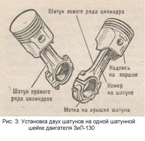 Шатун служит для соединения коленчатого вала с поршнем. Через шатун давление на поршень при рабочем ходе передается на коленчатый вал. При вспомогательных тактах (впуск, сжатие и выпуск) через шатун поршень приводится в действие от коленчатого, вала. Шатун (рис. 3) состоит из стального стержня двутаврового сечения, верхней неразъемной и нижней разъемной головок. В верхней установлен поршневой палец, а нижняя закреплена на шатунной шейке коленчатого вала. Для уменьшения трения в верхнюю головку шатуна запрессована бронзовая или биметаллическая с бронзовым слоем втулка, а в нижнюю, состоящую из двух частей, установлены тонкостенные вкладыши, представляющие собой стальную ленту, внутренняя поверхность которой покрыта тонким слоем антифрикционного сплава (ЗиЛ-130 – высоко- оловянистый алюминий). Обе части нижней головки шатуна скреплены двумя болтами, гайки которых во избежание самоотвертывания фиксируются. В двигателе ЗИЛ-130 под гайки подкладываются специальные шайбы, момент затяжки гаек 80 .90,Н-м., а самоотвертыванию препятствуют специальные штампованные стопорные гайки. Затяжку стопорной гайки необходимо производить путем ее поворота на 1,5 . 2 грани от положения соприкосновения о основной гайкой.