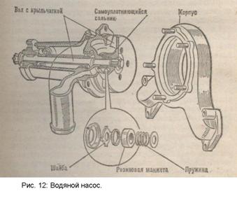 Водяной насос. Принудительная циркуляция жидкости в системе охлаждения создается водяным насосом центробежного типа. Насос установлен в передней части блока цилиндров и состоит из корпуса, вала с крыльчаткой и самоуплотняющегося сальника (рис. 12). Под действием центробежной силы, возникающей при вращении крыльчатки, охлаждающая жидкость из нижнего бачка радиатора поступает к центру корпуса насоса и отбрасывается к его наружным стенкам. Из отверстия в стенке корпуса насоса охлаждающая жидкость попадает в полость охлаждения блока цилиндров. Вытеканию охлаждающей жидкости между корпусом насоса и блоком препятствует прокладка, а в месте выхода вала — самоуплотняющийся сальник, состоящий из резиновой манжеты, металлической обоймы, пружины и шайбы.