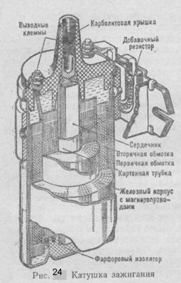 Катушка зажигания служит для преобразования тока низкого напряжения в ток высокого напряжения (с 12 В 3—24 кВ). Она состоит из следующих основных частей (рис. 24): сердечника, первичной обмотки из 250 .400 ков толстого изолированного медного провода диаметром 0,8 мм, картонной трубки, вторичной обмотки . 25 тыс. витков тонкого провода диаметром 0,1 мм, железного корпуса с магнитопроводами, карболитовой крышки, клемм и добавочного резистора. Вторичная обмотка расположена под первичной и отделена от нее слоем изоляции. Концы первичной обмотки выведены на клеммы карболитовой крышки. Один конец вторичной обмотки соединен е первичной обмоткой, а второй выведен а центральную клемму карболитовой крышки.