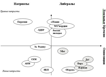 В то же время официальные прокремлевские движения, по сути, не могут не быть либералами в вопросах, например, экономики: ведь они позиционируют себя как пропрезидентские силы, а нынешний президент пытается выглядеть либералом в экономической политике. Именно поэтому они оказываются на грани патриотов и "либералов". Отсюда же социальный консерватизм "Единой России", которая пытается сочетать в себе как умеренный патриотизм, так и сильную социальную политику с рыночной экономикой.