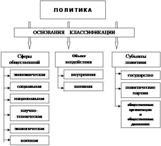 На рисунке приведена классификация политики. Это поможет полнее представить влияние политики на все сферы общественной жизни.
