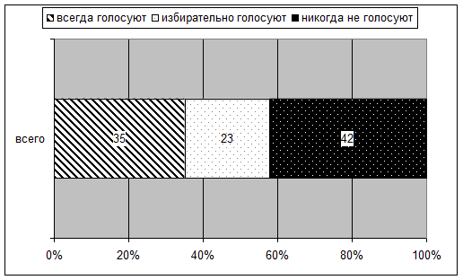 Желание участвовать в выборах у людей среднего и старшего поколения, как правило, связано с воспитанной в прошлые годы ответственностью, сформированной гражданской позицией. Молодежь же стоит в явной оппозиции ко всему институту выборов в нашей стране. Ее политическая активность, если и не равна нулю, то далека от идеальной.