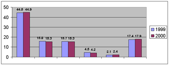 Рис. 2. Количество малых предприятий по основной отрасли (1999-2000 гг.) (%).