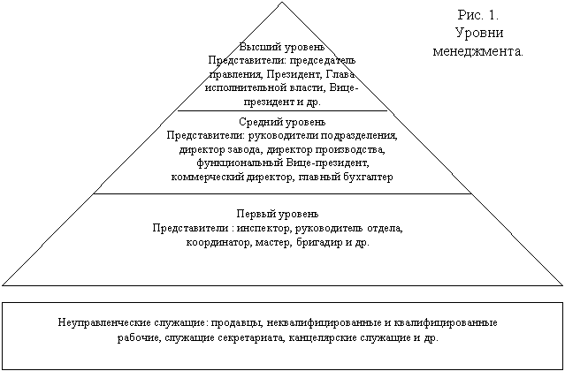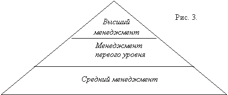 Примером деления на уровни менеджмента по степени властных полномочий, субординации и выполняемым функциям может служить рис. 1.