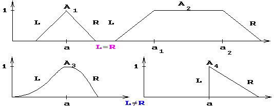Примеры графиков функций принадлежности нечетких чисел (L-R)-типа приведены ниже.